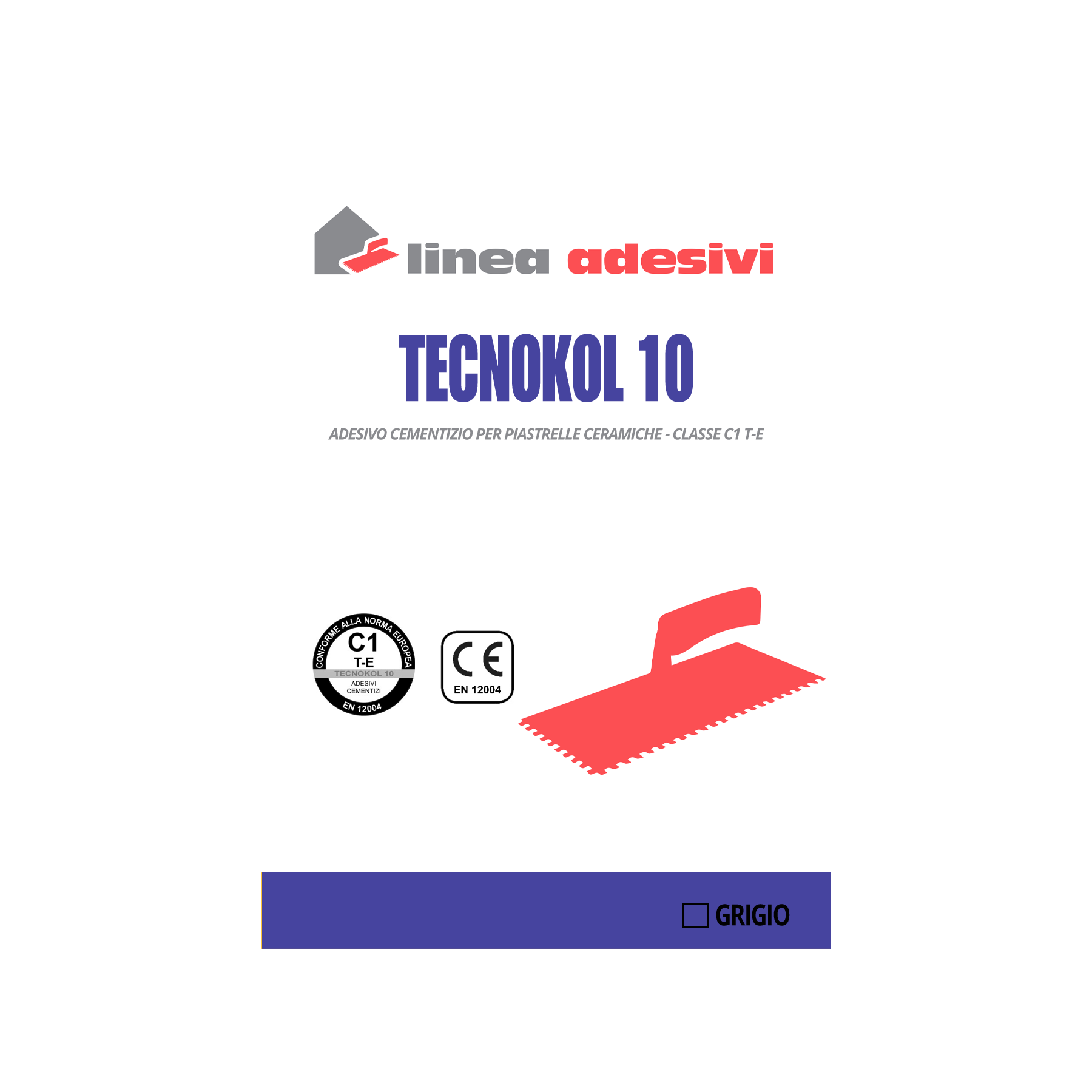 TECNOKOL 10 GRIGIA è un collante cementizio (C1) di colore bianco per la posa di pavimenti ceramici di piccolo formato (Lmax 30 cm) su supporti orizzontali e verticali in ambiente interno – esterno. TECNOKOL 10 GRIGIA presenta elevata adesione e lavorabilità, è resistente allo scivolamento (T), tempo aperto prolungato (E), buona flessibilità e facilità d’utilizzo. Atossico, ingelivo.